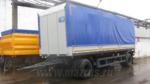Прицеп - шасси с настилом МАЗ-837810-1012 : 2-x осный., двухскатный.,подвеска рессорная, г/п 14,35 тн., АБС, длина монтажной платформы 7715мм. Пол деревянный . Соответствует требования TIR для перевозки различных грузов в системе транзитных перевозок МДП в составе автопоезда.