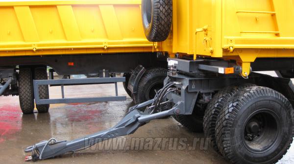 Оси трубчатого сечения с барабанным тормозным механизмом (колесные тормозные механизмы 420х160). Подвеска рессорная «МАЗ», Оси колес прицепа предусматривают установку двухскатных дисковых колес.