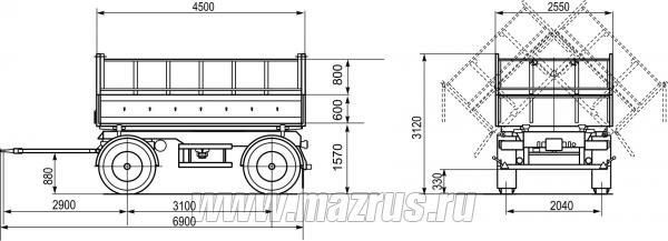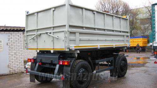 Прицеп самосвальный с двухсторонней боковой разгрузкой МАЗ-857100-4012 : 2-х осный.,односкатный., Г/п-10,6 тн., АБС., V-14,7 м3., внутренние размеры 4340х2400х1400мм. Кузов металлический , разгрузка боковая двухсторонняя, механизм опрокидования кузова-гидравлический с приводом от гидросистемы автомобиля. Предназначен для перевозки различных сыпучих грузов и сельскохозяйственных грузов.