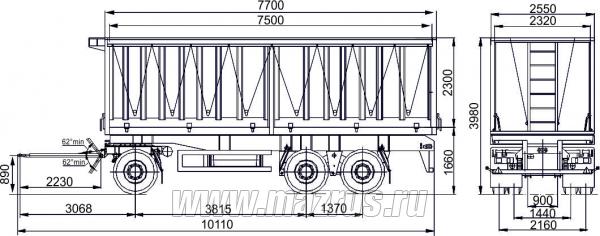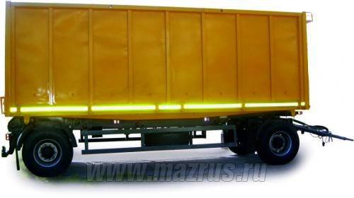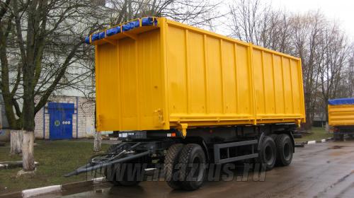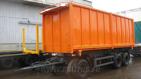 Прицеп самосвальный щеповоз с двухсторонней боковой разгрузкой МАЗ-856102-5010 : 3-х осный.,двухскатный., Г/п-21 тн., АБС., V-40 м3., подвеска рессорная., шины 12,00R20., внутренние размеры 7500х2320х2300мм. Кузов металлический , разгрузка боковая двухсторонняя, механизм опрокидования кузова-гидравлический с приводом от гидросистемы автомобиля. Предназначен для перевозки различных объемных грузов с малой удельной массой.