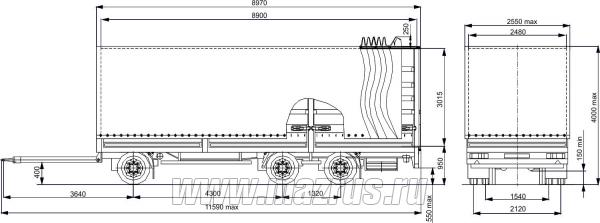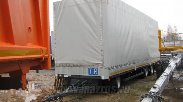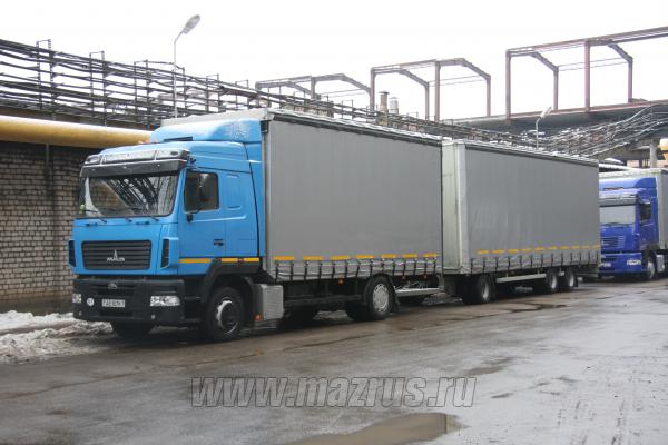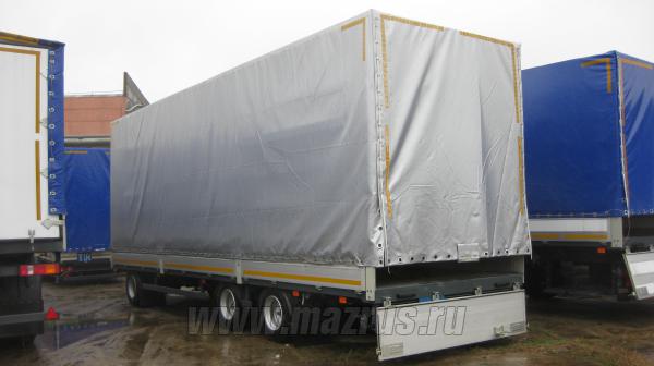 Прицеп тентованный МАЗ-870102-3012 : 3-х осный,двухскатный ., г/п 18 тн., V-65 м3, пневмоподвеска, АБС, внутренние размеры 8900х2480х2985мм. Пол из ламинированной фанеры борта алюминиевые, откидные, крыша и пологи сдвижные. Соответствует требования TIR для превозки различных грузов в системе транзитных превозок МДП с автомобилем –тягачом МАЗ-5340 ; 6312.
