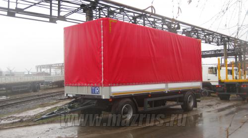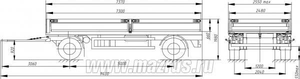 Прицеп бортовой МАЗ-870110-2010 : 2-х осный., односкатный., г/п-13 тн., АБС, пневмоподвеска, внутренние размеры 7300х2480х660мм. Пол из ламинированной фанеры, борта металлические, откидные. Соответствует требования TIR для перевозки различных грузов в системе транзитных перевозок МДП в составе автопоезда.