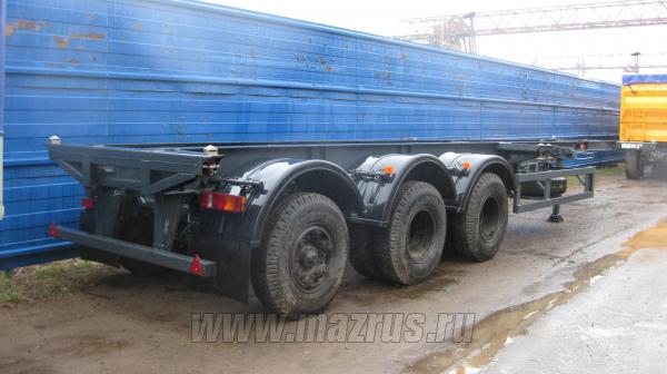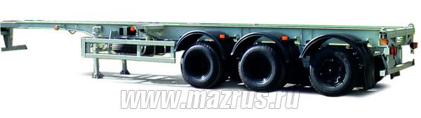 Полуприцеп-контейнеровоз МАЗ-938920-013: 3-х осный., Г/п-33 т., АБС., ССУ-1240 мм., нагрузка на ССУ-14,7 т., габаритные размеры 12260х2500х1495мм., подвеска рессорно-балансирная (двухскатная ), задняя ось неповоротная, оси МАЗ., шины 11,00R20. Третья ось самоустанавливающаяся с блокировкой из кабины тягача. Полуприцеп-контейнеровоз с несущей рамой , предназначен для перевозки контейнеров ( одного контейнера типа 1АА или 1А, или двух контейнеров 1С ) в составе автопоезда.