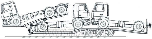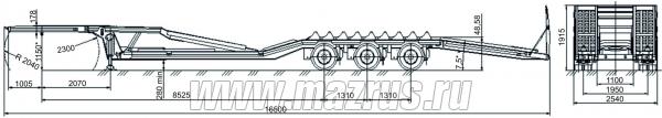Полуприцеп трал МАЗ-940100-010 : 3-х осный., двухскатный., Г/п-23 тн., АБС., нагрузка на ССУ-10,9 тн., ССУ-1150 мм., угол въезда 16 градусов., длина погрузочной площадки 8500 мм., габаритные размеры 16500х2550х1950мм. Подвеска пневматическая BPW., шины 235/75R17,5 Continental. Полуприцеп –автовоз предназначен для перевозки 3-х тяжелых автомобильных тягачей или шасси.