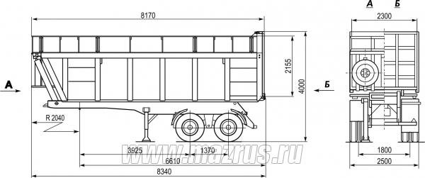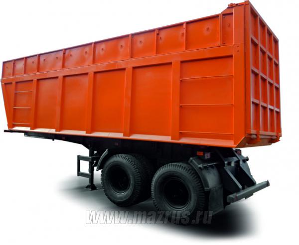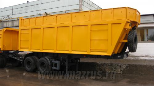Полуприцеп самосвальный МАЗ-950600-030 : 2-х осный.,двухскатный., АБС., V-40м3., Г/п-16 тн., высота ССУ-1370мм., внутренние размеры 7060х2300х2155мм. Угол подъема платформы 50 градусов, кузов цельнометаллический, сварной с ровным полом, с разгрузкой назад через автоматически открывающийся задний борт с верхней навеской. Предназначен для перевозки щепы судельным весом 0,4 тн/м3 в составе автопоезда с автомобилем тягачем , имеющим гидрооборудование.