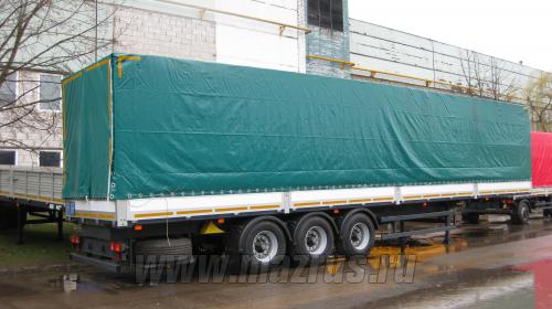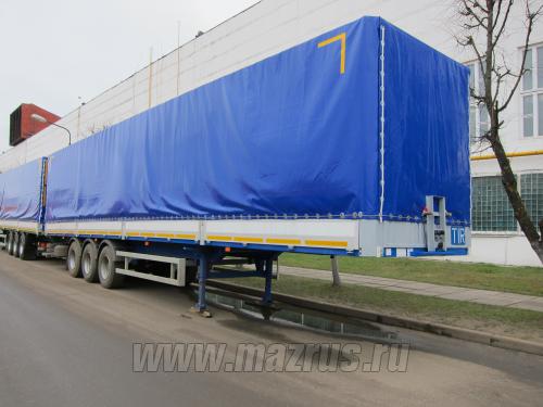 Полуприцеп бортовой тентованный МАЗ-975830-3012 : 3-х осный., односкатный., пневмоподвеска., оси BPW либо SAF., Г/п-27,9 тн., V-89 м3., высота ССУ 1150мм., нагрузка на ССУ-10,6 т., АБС., внутренние размеры 13620х2480х2650мм., шины 385/65R22.5., Пол из ламинированной фанеры 27мм., борта из сэндвич-панелей., откидные., решетки деревянные. Оборудован передним высоким бортом. Тент синтетический сварной. Боковые стойки складывающиеся съемные обеспечивают боковую загрузку без демонтажа каркаса тентовой надстройки. Задний полог. Соответствует требования TIR для перевозки различных грузов в системе транзитных перевозок МДП в составе автопоезда.