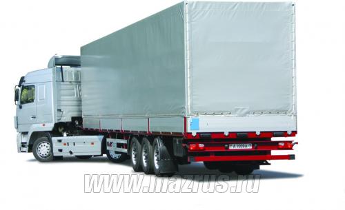Полуприцеп бортовой тентованный МАЗ-975830-3018 : 3-х осный., односкатный., пневмоподвеска., оси BPW либо SAF., Г/п-27,9 тн., V-89 м3., высота ССУ 1150мм., нагрузка на ССУ-10,6 т., АБС., внутренние размеры 13620х2480х2650мм., шины 385/65R22.5., Пол из ламинированной фанеры 27мм., борта из анодированного алюминиевого профиля., детали платформы ф.Hestenberg., эл.оборудование ф.Aspoeck., откидные., решетки деревянные. Оборудован передним высоким бортом. Тент синтетический сварной. Боковые стойки складывающиеся съемные обеспечивают боковую загрузку без демонтажа каркаса тентовой надстройки. Задний полог. Соответствует требования TIR для перевозки различных грузов в системе транзитных перевозок МДП в составе автопоезда.