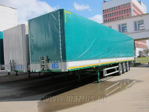 Полуприцеп бортовой тентованный МАЗ-975830-3021 : 3-х осный., односкатный., пневмоподвеска., оси BPW либо SAF., Г/п-27,9 тн., V-89 м3., высота ССУ 1150мм., нагрузка на ССУ-10,6 т., АБС., внутренние размеры 13620х2480х2650мм., шины 385/65R22.5., Пол из ламинированной фанеры 27мм., борта из сэндвич-панелей., откидные., решетки деревянные. Оборудован передним высоким бортом, со сдвижным тентом ф.Ringfer VBG (Германия) . Задний полог. Соответствует требования TIR для перевозки различных грузов в системе транзитных перевозок МДП в составе автопоезда.