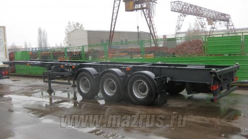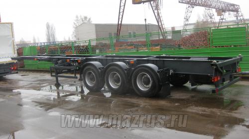 Полуприцеп-контейнеровоз МАЗ-991900-012: 3-х осный., односкатный., Г/п-30 т., АБС., ССУ-1250 мм., нагрузка на ССУ-12 т., габаритные размеры 12260х2500х1495мм., подвеска пневматическая с передней подъемной осью , оси МАЗ., шины 385/65R22,5. Полуприцеп-контейнеровоз с несущей рамой , предназначен для перевозки контейнеров типа ( 1АА или 1А, 1В, 1ВВ, 1С, 1СС) в составе автопоезда.