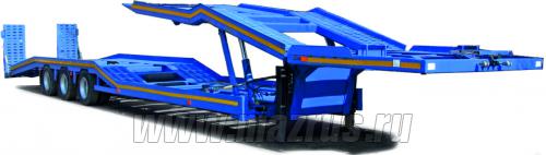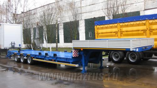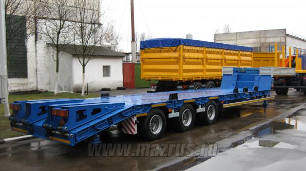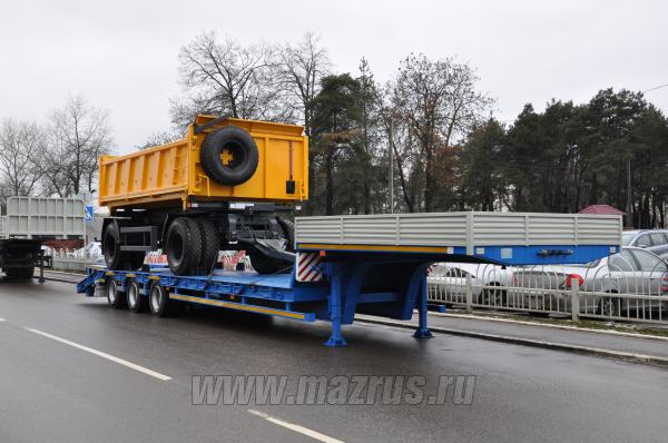 Полуприцеп трал МАЗ-997700-011 : 3-х осный., двухскатный., Г/п-30 (41)*тн., АБС., нагрузка на ССУ-15,9 тн., ССУ-1350-1400 мм., погрузочная высота 865 мм., угол въезда 14 градусов., длина погрузочной площадки 8500 мм., габаритная ширина 2500 мм (с уширителями 3030 мм). Подвеска пневматическая BPW., шины 235/75R17,5 Continental. Низкорамный полуприцеп-тяжеловоз предназначен для перевозки дорожной и строительной техники, а также крупногабаритных неделимых грузов.