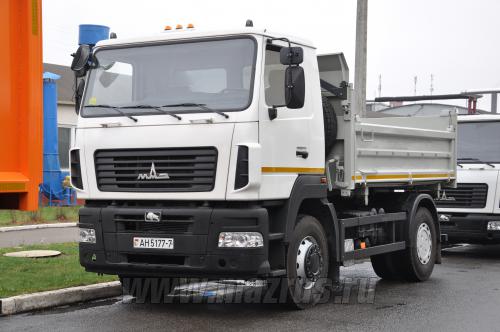 Автомобиль-самосвал МАЗ-5550С5-520-021 (Евро-5) с 3-х сторонней разгрузкой, с колёсной формулой 4х2, предназначен для перевозки различных строительных сыпучих грузов в составе автопоезда. Отличительной особенностью автомобилей МАЗ является: надёжность, комфортабельные условия работы у водителя, низкие эксплуатационные расходы, современный дизайн, большой выбор моделей и комплектаций, применение узлов и агрегатов мировых производителей автомобильных компонентов таких, как ZF, Shaanxi Fast Gear, Cummins, Mersedes, ЯМЗ, ММЗ и т.д :
