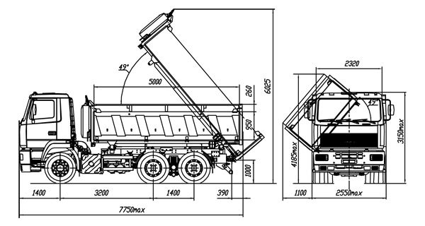 - объём кузова 11 м3 ( с надставными бортами V-14 м3 ), П- образная платформа прямоугольного типа с боковыми и задним открывающимися бортами, платформа без подогрева выхлопными газами;