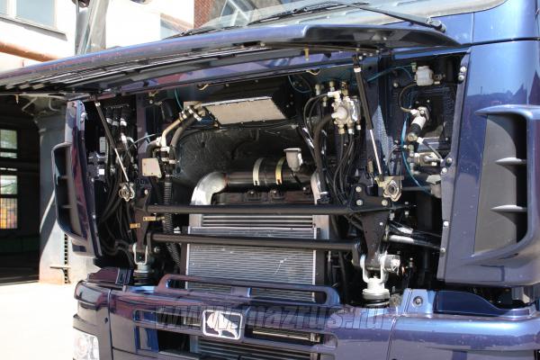 - На автомобиле установлен дизельный двигатель Mercedes OM 457 LA. V/4 ( Daimler Chrysler ) – это 6-цилиндрованный силовой агрегат с рядным расположением цилиндров, предназначенный для установки на грузовые автомобили, выполняющие перевозку различных тяжелых грузов, мощность428 л.с ( 315 кВт ), максимальный крутящий момент Нм-2100 при 1400 об / мин , Евро-5 ( производитель Mercedes-Benz ), рабочий объём двигателя составляет 12 литров, на двигателе установлена система подачи топлива Common Rail (производства GRS Bosch) c максимальным давлением впрыска до 160 МПа и система cелективной каталитической нейтрализации газов (SCR) c применением AdBlue ( мочевина ), для нормальной эксплуатации данного двигателя установлен следующий регламент периодичности замены масла и фильтров ( ТО-0 в районе 2 000 км, ТО-1 в районе 45000 км, ТО-2 в районе 90000 кми последующие ТО с интервалом в 45000 км), контрольный расход топлива на 100 км составляет 25 литровпри скорсти 60 км/ч и 27 литровпри скорсти80 км/ч, заявленный ресурс двигателя составляет 1 000 000 км