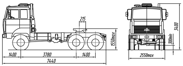 - Распределение технически допустимой общей массы: на передний мост 7000 кг, на заднюю тележку 25500 кг;