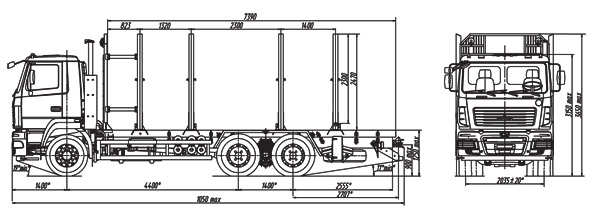 Платформа сортиментовозная с передним защитным бортом, сортиментовозное оборудование с 4-я ложементами, на заднем свесе рамы предусмотрена технологическая площадка для установки гидроманипулятора, объем платформы V-40 м3 без гидроманипулятора, площадь платформы 17 м2, внутренние размеры платформы 7390х2250х2300 мм;